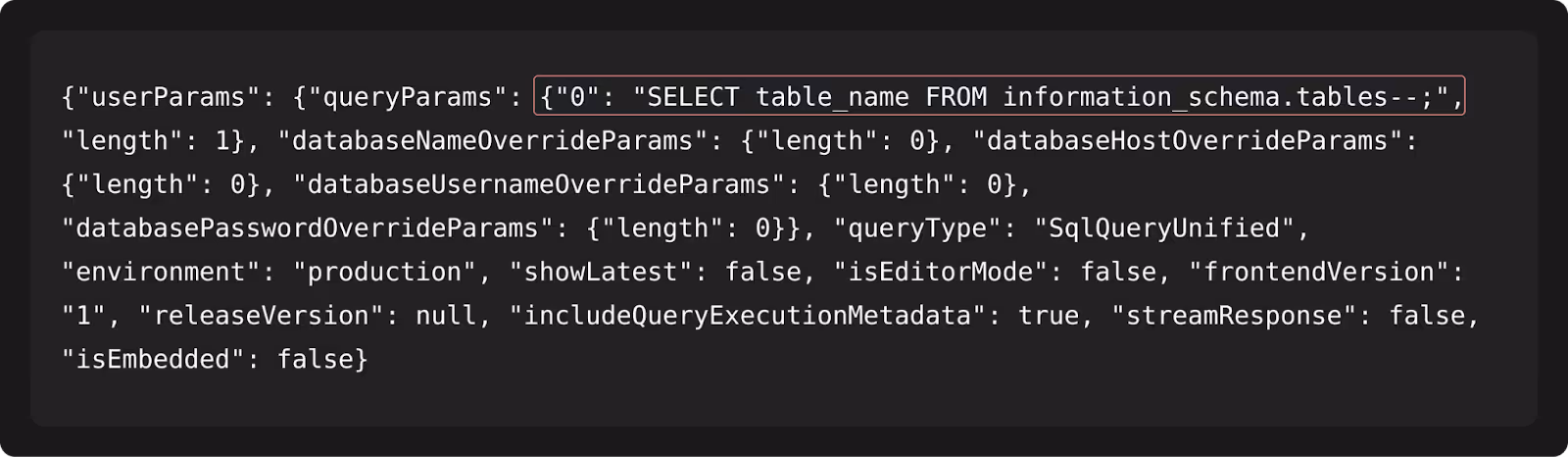 Although having credentials for post-authentication testing, Axel began unauthenticated, probing the target as an anonymous user with no privileges. During the enumeration of public APIs, Axel identified a candidate endpoint with a request body containing an SqlQueryUnified type: