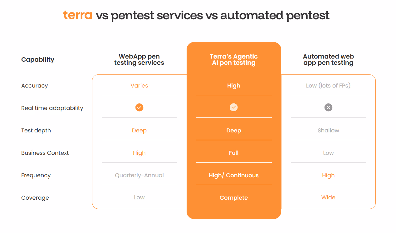 Intelligent offensive testing transforms CTEM from principle to practice. Terra’s agentic-AI platform acts as the validation layer of CTEM, continuously testing web applications and environments to confirm which exposures are exploitable and have real business impact. A swarm of AI agents adapts its testing logic based on each application’s behavior, much like experienced penetration testers would. At the same time, a built-in human-in-the-loop process adds expert oversight for accuracy, safety, and compliance.
